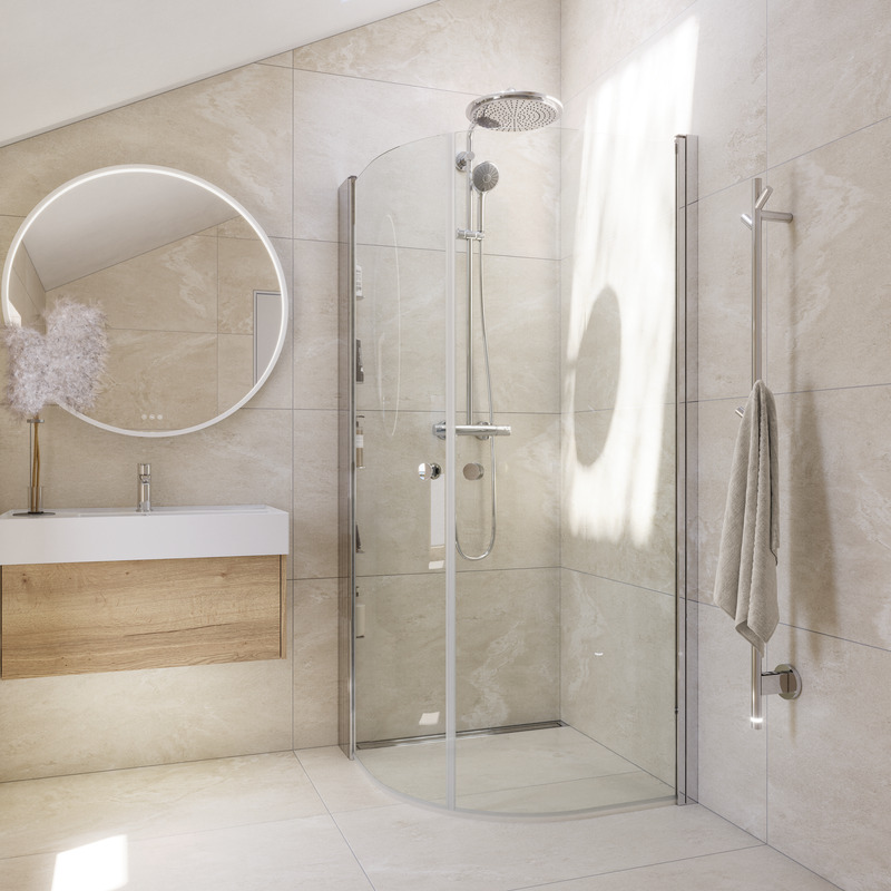 Eine geschwungene Duschecke hat den Vorteil, dass sie nicht so viel Platz einnimmt wie eine eckige. Hier gibt es mehr Bewegungsfreiheit im Bad und wenn die Duschecke nicht genutzt wird, lassen sich die Bögen ganz einschieben und bieten zusätzlichen Platz.