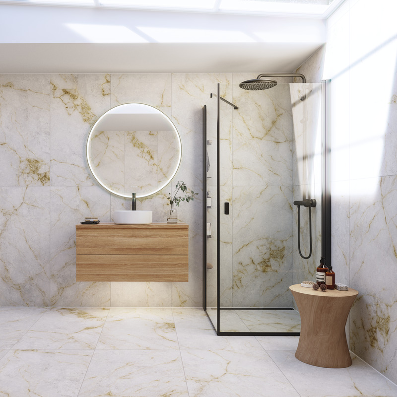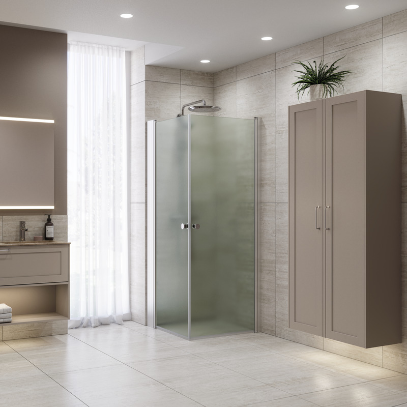 Eine Duschecke mit Eisglas gibt etwas mehr Privatsphäre während des Duschens und die Duschtüren aus Glas geben dem Rest des Badezimmers mehr Platz. Eisglas ist wie hier gezeigt mit satinierten Profilen erhältlich.